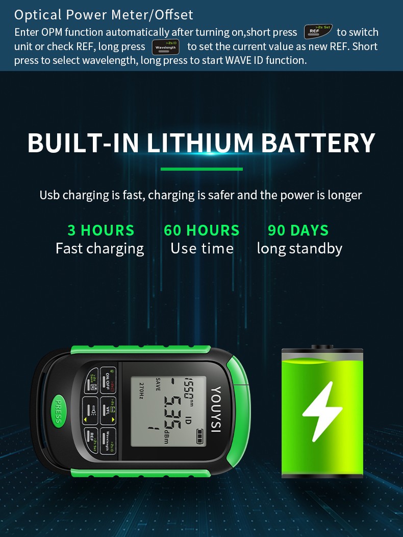 Equipped with 3.7V/450mAh Li-ion battery, working hours > 50 hours (only OPM).