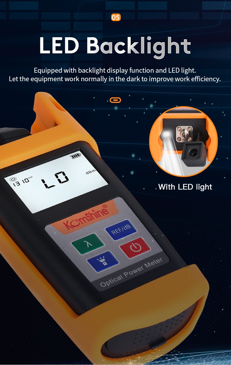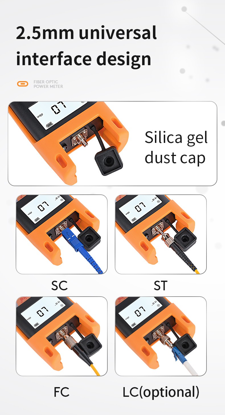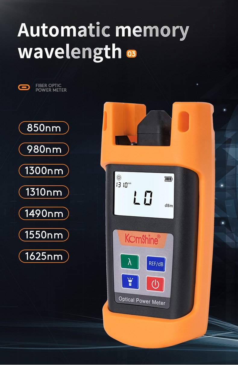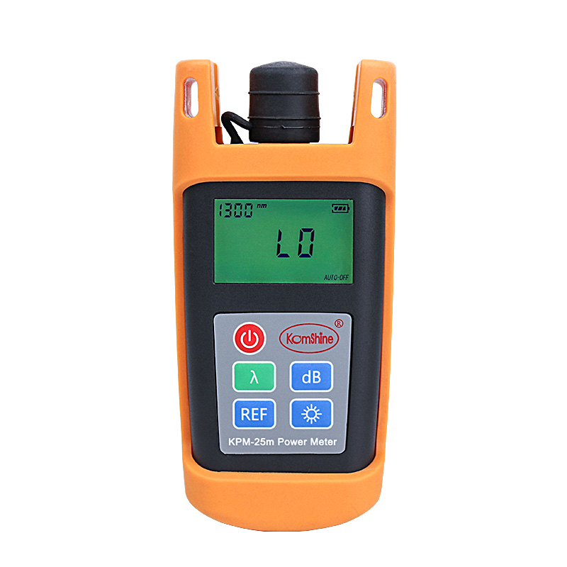 KPM-25 handheld optical power meter is a compact and an easy-to-use testing instrument for optical fiber networks, which can be used for absolute optical power measurements as well as for relative loss measurements in optical fibers. It features ingenious appearance, wide range of power measurement, high accuracy and user self-calibration function with high performance-to-price ratio.