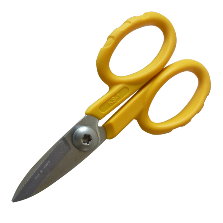 The KS 1 Kevlar shears are lightweight shears ideal for cutting Kevlar strength members found in fiber optic cable construction with ergonomic molded handles provide comfort for both right and left Handed users. One micro-serrated blade reduces slippage for more positive cutting action and blades made from high carbon molybdenum, and vanadium steel for long life.